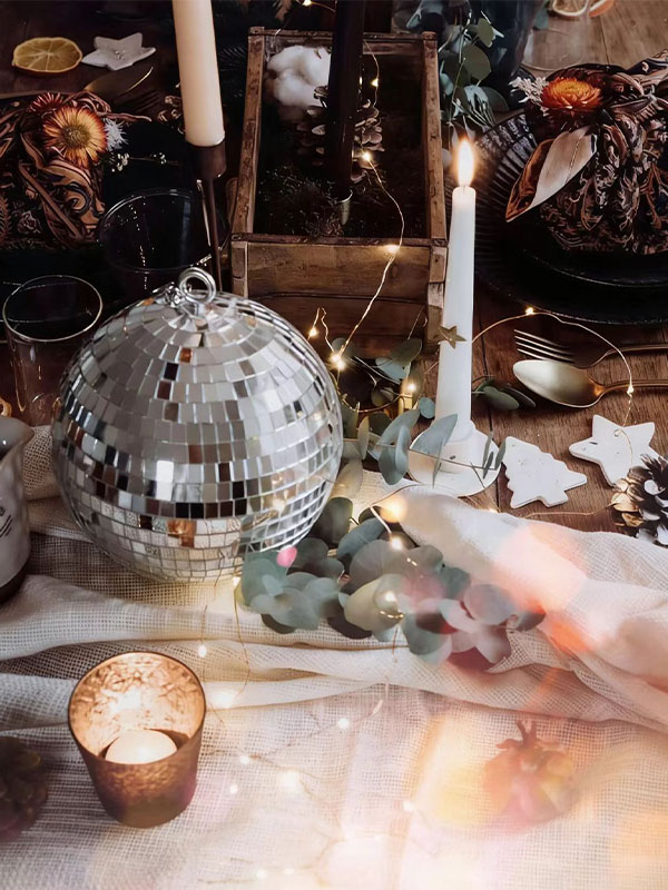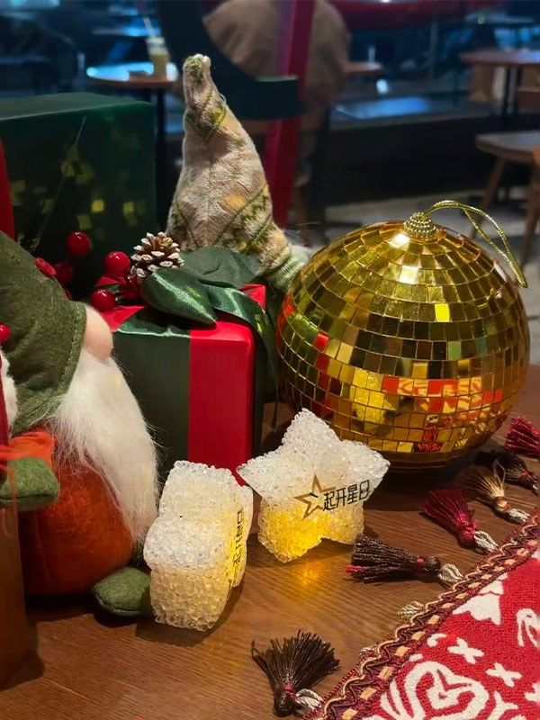 The product features a reinforced fiberglass (FRP) structure with a surface finished with hand-applied Mirror Mosaic tiles. The reflective surface enhances lighting effects and creates a strong visual appeal in commercial environments.